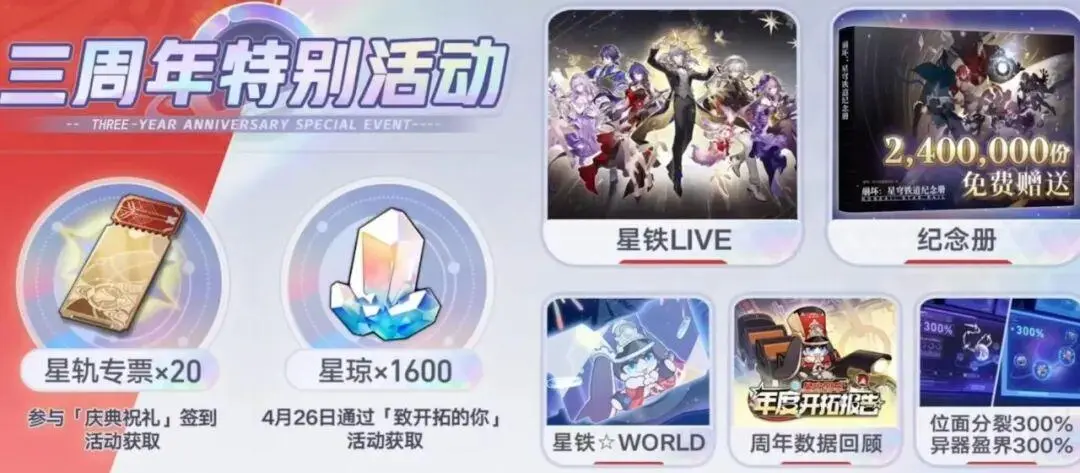 且说,4.2周年庆福利安排,从上一年周年庆的情况来看,这次4.2周年庆福利必须加码。包括但不限于双倍重置、签到送10连、邮件赠送1600星琼、网页小活动、累充累消肯定会安排,但估计会升级,例如分档位有不同的福利,不再局限单一福利。